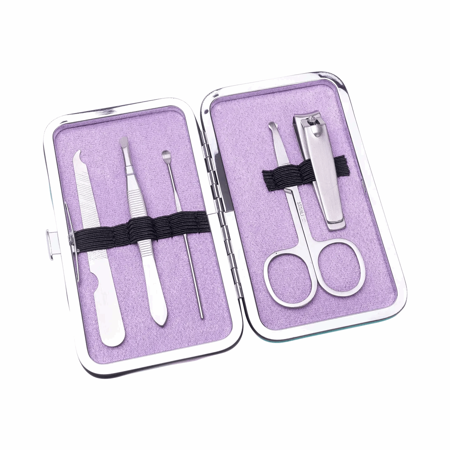Manicure set with 5 stainless steel tools (nail file, tweezers, cuticle tool, nail clippers, cuticle scissors) in a durable case. Stylish and portable for on-the-go use.
