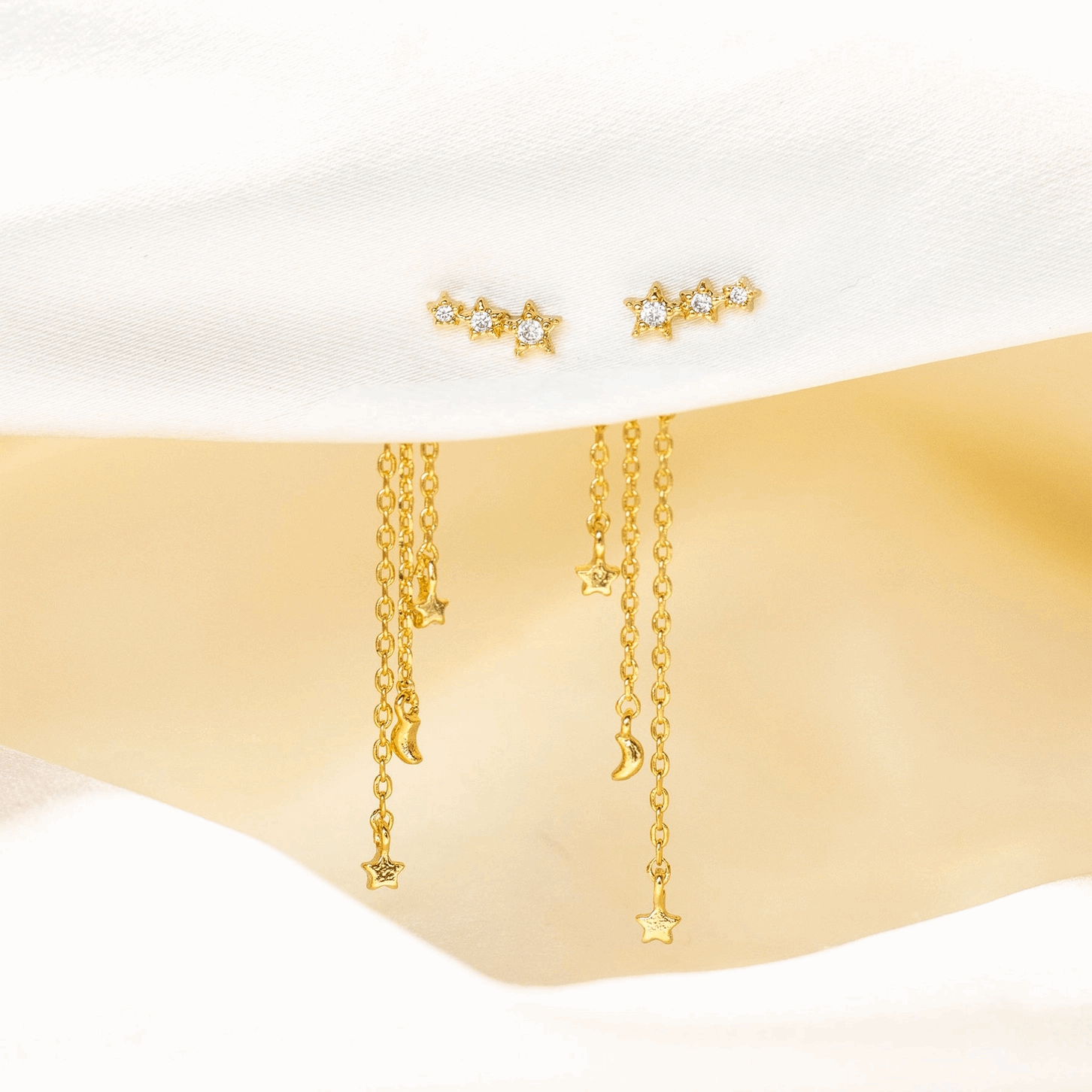 The stars shower around you when you have these earrings on! We love the way the tiny stars and moons cascade down and frame the face.